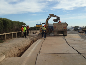 Bored pier and pile cap installation including site establishment, traffic management, survey, demolition of kerbing, footpath and bitumen, installation of bored piers, excavation for pile cap and installation of formwork, reinforcement and concrete to capping beam.